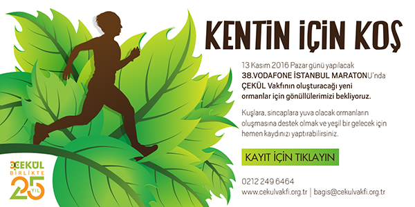 38. Vodafone Avrasya Maratonunu yaklaşıyor. Vodafone İstanbul Maratonunda ÇEKÜL Vakfının oluşturacağı yeni ormanlar için gönüllülerimizi bekliyoruz. Siz de 13 Kasım 2016 Pazar günü yapılacak maratonda ÇEKÜL gönüllüsü olabilir, 10 km, 15 km ve 42 km etaplarına katılabilirsiniz. Koşunun yanı sıra Halk Yürüyüşüne de katılarak destek verebilirsiniz.