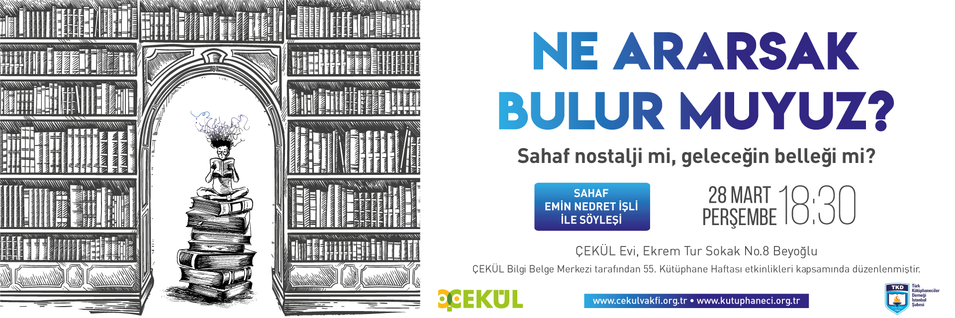 55. Kütüphaneciler Haftası kapsamında, ÇEKÜL Bilgi Belge Merkezi, gelenekselleşen söyleşi etkinliğini bu yıl Sahaf Emin Nedret İşli ile gerçekleştirecek. Beyoğlu’ndaki ÇEKÜL Evinde 28 Mart Perşembe saat 18:30’da başlayacak söyleşi herkesin katılımına açık.