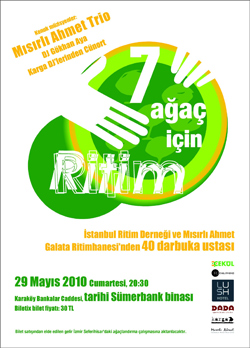İstanbul’un kimlikli yapılarından biri, Mısırlı Ahmet ve 40 darbuka ustasının katılacağı canlı ritim performansı... ÇEKÜL Vakfı 29 Mayıs 2010’da Karaköy’deki tarihi Sümerbank binasında, 7 Ağaç İçin Ritim adlı bir etkinlik düzenliyor. Etkinlikten elde edilen gelir, İzmir Seferihisar’daki ağaçlandırma çalışmasında kullanılacak.