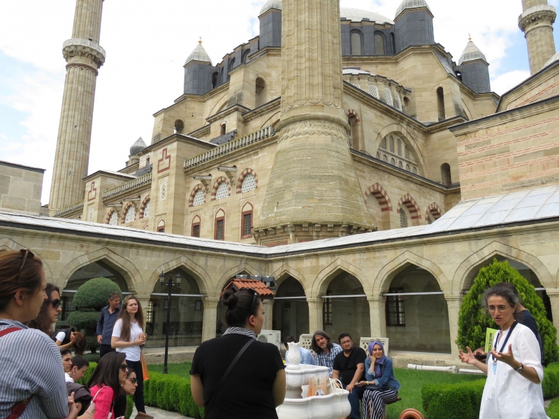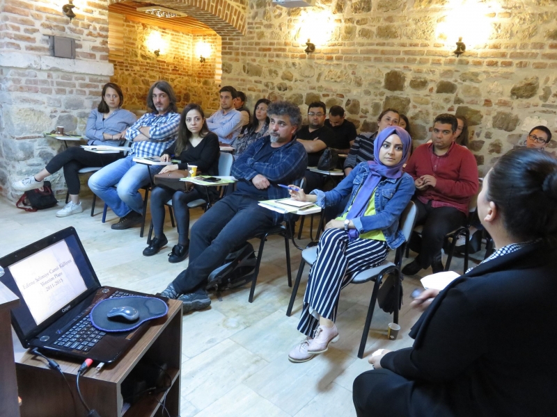 “Edirne Selimiye Camisi ve Külliyesi Alan Yönetimi Planı 2011-2015” değerlendirmesi ve 2016-2020 yıllarına ait plan hazırlıklarında yönetsel politikaların belirlenmesiyle başlayan eğitimin ilk gününde hedefler ve yeni nesil eylemler ele alındı. Yaşagül Ekinci Danışan, Selimiye Camisi ve Külliyesinin UNESCO Dünya Miras Listesine giriş sürecinin detaylarını aktarırken, Selimiye’nin evrensel değeri ile eylem temalarının belirlenmesindeki ihtiyaç analizlerini de aktardı. Eğitim, Edirne UNESCO Alan Başkanlığından mimar Sibel Kıyak’ın sunumuyla devam etti. “Selimiye Camisi ve Külliyesi 2011-2015 Yönetim Planı”nda izleme, değerlendirme, plan eylemlerindeki gerçekleşme oranları, eylemlerin uygulanma veya uygulanmamasını etkileyen ana unsurlar ile alan yönetimi kurullarındaki kurum ve kuruluşların yönetim planının işlerliğindeki rolünün anlatıldığı bu sunumun ardından yönetim planı sınırları içindeki yerler gezildi. Selimiye Camisi ve Külliyesi ile çevresindeki arkeolojik kazı alanı, Edirne Kent Müzesi, Edirne Büyük Sinagog, Edirne Surları kazı alanı, Kapalı Çarşı, Üç Şerefeli Cami ve Makedonya Kulesi, Vakıflar Müzesi, Eski Cami ve Kervansaray, gezi alanı içinde görülen yerler oldu.