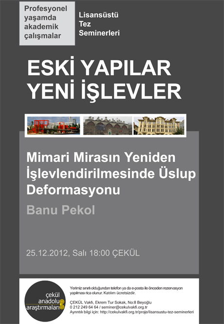 Dr. Banu Pekol seminerde, son 50-60 yıl içindeki gelişmeler ışığında ve kültür ürününün metamorfozu/metalaşması üzerinden, Türkiye'deki yeni işlevlerle kullanılan mimari mirasta baş gösteren görünüşe odaklanma sorunsalını değerlendirecek. Seminerde, modernite ile başlayan ve özellikle Frankfurt Okulu tarafından estetik kuramla ilişkilendirilmiş süreci göz önünde bulundurarak Türkiye ve İstanbul'daki süreci, evrensel metalaştırmanın yerel bir örneği olarak incelenecek.