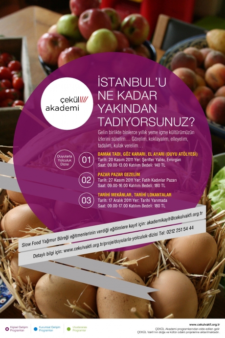 ÇEKÜL Akademi ve Slow Food Yağmur Böreği Birliği’nin Duyularla Yolculuk Dizisi eğitim paketinin üçüncü programı “Tarihi Mekânlar, Tarihi Lokantalar”, İstanbul’un Tarihi Yarımadası’nda, Mısır Çarşısı, Tahtakale güzergâhındaki pazar alışverişinden ürün çeşitliliğine, gıda ticaretinden ürünlerin depolandığı hanların mimarisine uzanıyor ve tarihi yemek mekânlarında tamamlanıyor.
