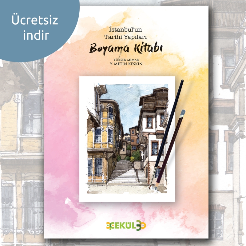 PDF formatında ücretsiz indirebileceğiniz, İstanbul'un Tarihi Yapıları Boyama Kitabı yayında. Suluboya ya da kuru kalem boyama önerisiyle, Y. Metin Keskin’in çizdiği İstanbul’dan dokuz tarihi yapının desenine yer verdiğimiz kitapta: Beyoğlu'ndaki ÇEKÜL Evi, Birinci Vakıf Han, Galata Kulesi, Kadıköy, Kapalıçarşı Mercan Çeşme, Kız Kulesi, Ostrorog Yalısı, Amcazede Yalısı, Ortaköy Camisi, Haseki Hürrem Sultan Hamamına bu kez renklendirmek için yakından bakacağız. Yapıların hikâyelerini de kitabın sonunda sizler için derledik.