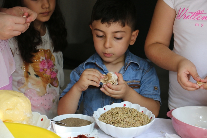 Sohbetin, türkülerin, manilerin, hikâyelerin de yeri vardı Yemek Atölyesinde. Erkekler dibekte haşhaş döverken, kadınlar bir yandan ekmek teknelerinde hamur yoğurdu; kızılcık kazanı başında türküler söylendi, maniler okundu. Müjgan teyze incire ceviz doldururken, Güllü abla kalbura bastının nasıl yapıldığını anlattı çocuklara. Yorgunluk atmak için bahçelerde semah dönüldü. Kadın, erkek, çocuk yaklaşık 80 kişi 3 farklı evde bu lezzet şenliğinin bir parçası oldu.