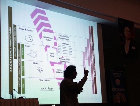 “Kentsel dönüşüm, gayrimenkul geliştirme değildir. Gayrimenkul geliştirme, piyasa güçleri ile gerçekleşir. Kentsel dönüşüm ise kamu desteğine gereksinim duyulan yoksulluk bölgelerinde, ekonomik ve sosyal boyutu da içeren, uzun vadeli eylemler bütünüdür. Bunun için yarışan kentler mi? Paylaşan kentler mi? diye sormamız gerek. Kentler, üçüncü dönüşüm sürecinde değerlerini, birikimlerini, kaynaklarını, deneyimlerini paylaşmalı. Ve tasarımcılar kesinlikle bu üçüncü dönüşüm sürecine dâhil edilmeli. Geçmişte yaptığımız hataları bu süreçte yapmamak için tüm projelerin tasarımcıların katkısıyla hazırlanması gerekiyor. Kimlikli, kişilikli kentleri ancak bu şekilde yeniden kurgulayabiliriz. Bunun için Kadıköy’de bir tasarım atölyesi açtık. Bir fikrim var diyen herkes bu atölyede Kadıköy Belediyesi için üretim yapabilecek. Tarihi Kentler Birliği artık Türkiye’nin ulusal koruma planını hazırlamalıdır. Metin hocamın 70’lerde yapı-sokak ölçeğinde başlattığı süreç artık bu noktaya gelmiştir. Bir ‘koruma yasası’ çıkartılmalıdır. Belediyelerden toplanan yüzde onlarla oluşturulan koruma fonu yeterli değildir.”