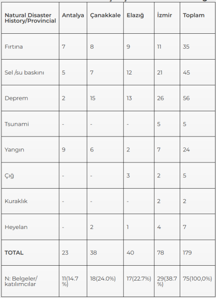 Tabloda belirtilen, Dokuz Eylül Üniversitesi bünyesinde ve “fırtınalar” özelinde yürüttüğümüz BAP (Bilimsel Araştırma Projesi) çalışmalarında ortaya çıkan “il risk algısı” gösterilmiştir. Tablo 1’de görüldüğü gibi, çalışmanın yapıldığı dönem Mayıs 2021- Mayıs 2022 dönemi itibarıyla ortaya çıkan algılarla, yaşanmış olaylar arasında doğru orantılı bir ilişki bulunmaktadır.