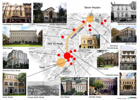 Pera Bölgesi’ne 16. yy. dan itibaren yerleşmeye başlayan yabancı elçilikler bu bölgede yeni bir semt oluşturmuşlardır. Bu semtin oluşması da “Dört Yol” olarak tanımlanan bölgede gerçekleşmiştir. Dört Yol olarak bilinen bu bölge, bugünkü isimleriyle İstiklal Caddesi, Asmalımescit Sokağı ve Kumbaracı Yokuşu’nun kesiştiği noktadır. Sefarethanelerin birkaç tanesi dışında büyük çoğunluğu Galata Mevlevihanesi ile Galatasaray arasında kalan bölgede, genelde İstiklal Caddesi’nin Boğaziçi’ne bakan tarafında yer almaktadır. Dört Yol’un Boğaziçi’ne bakan kısmında yer alan sefarethaneler Fransız Sarayı, Rus Sarayı, Venedik Sarayı, Hollanda Sarayı, İsveç Sarayı ve Prusya Elçilik Binası’dır. Dört Yol’un Tarlabaşı yönünde yer alan sefarethaneler ise İngiltere Elçilik Binası (Pera House) ve Amerika Elçilik Binası’dır.
