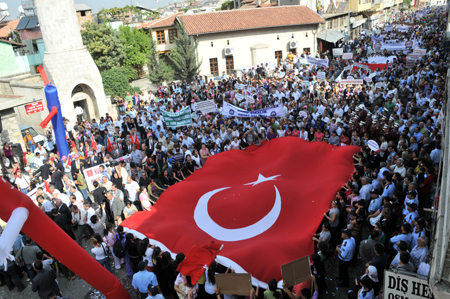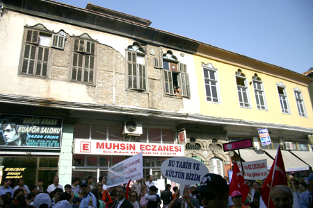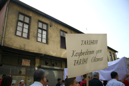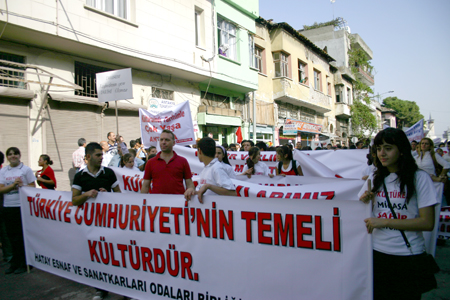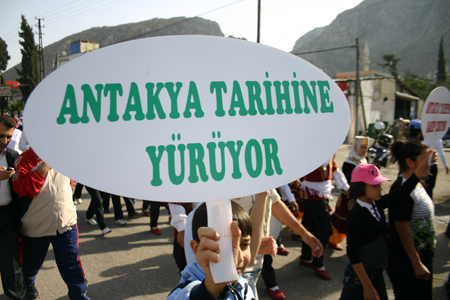 Antakya’nın tarihi dokusunun paralel uzandığı Kurtuluş Caddesi’nde devam eden yürüyüşte, üç yüze yakın farklı sloganla, tarihi ve kültürel dokunun yaşatılması için mesajlar verildi.